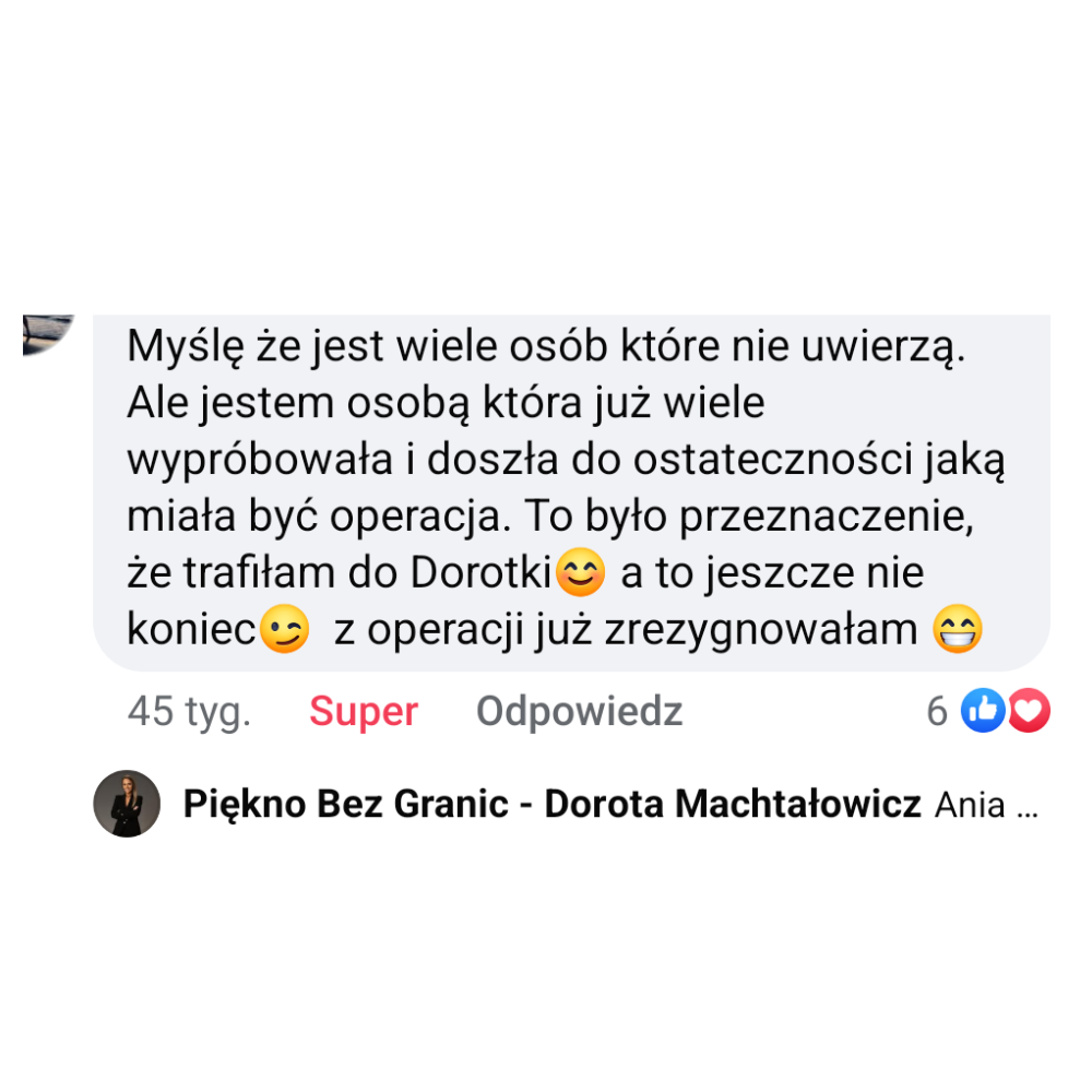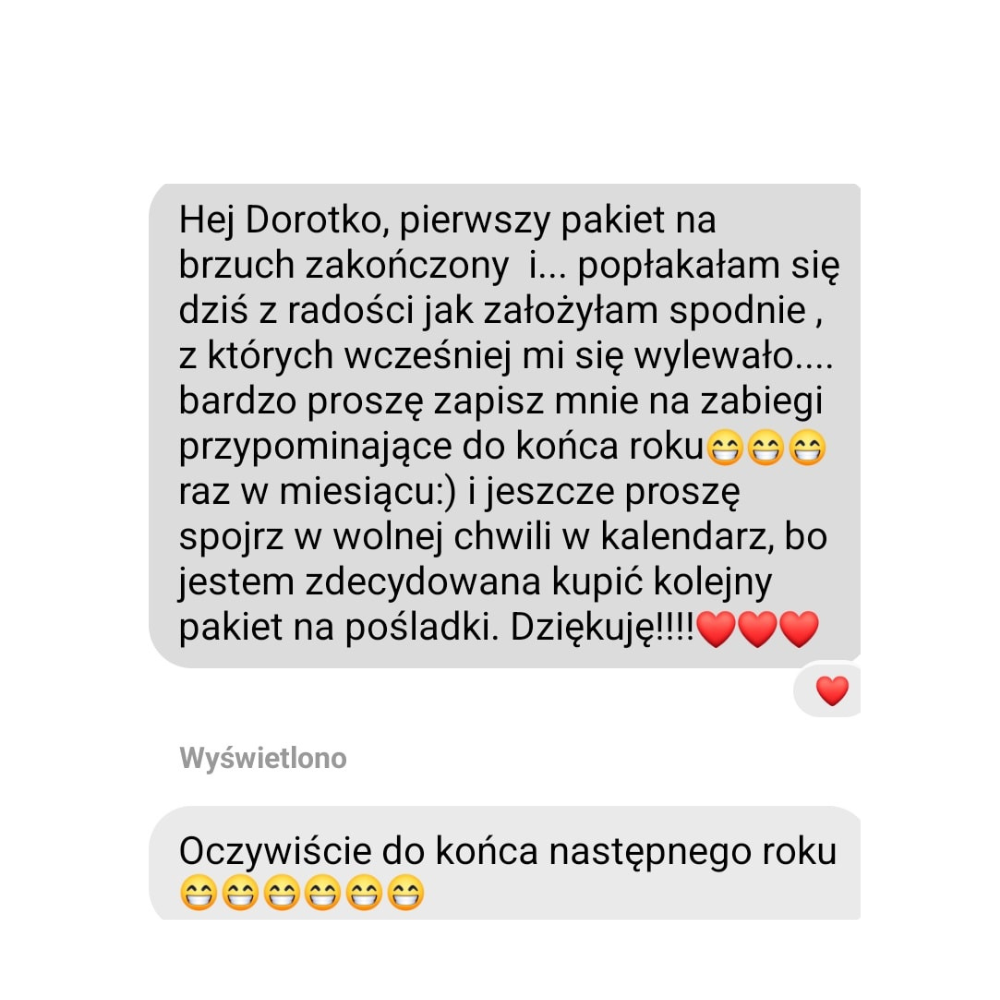 Mam na imię Dorota, z pasją angażuje się w pomoc klientkom w osiąganiu ich wymarzonych efektów. Moje podejście łączy profesjonalizm i zrozumienie, co sprawia, że każda pacjentka może poczuć się komfortowo i swobodnie podczas naszej współpracy. Pomogłam już 759+ kobietom zmienić ich ciało i poprawić samoocenę.